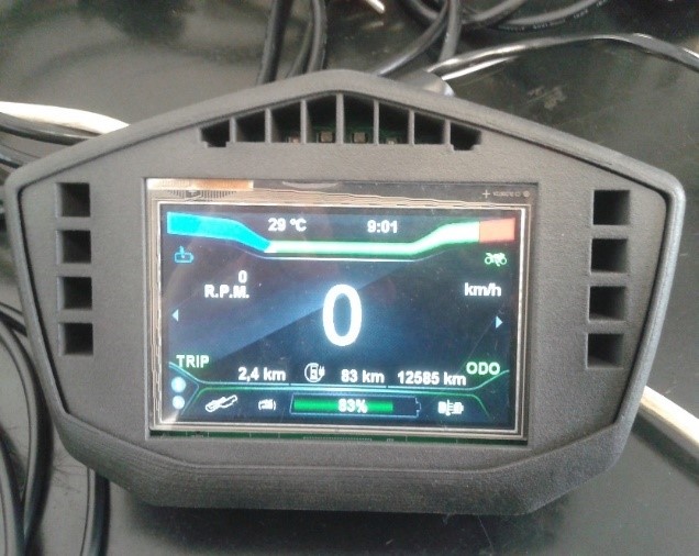 The enclosure of T-DASH has been redesigned in order to host the STM32 board and it has been made in Rapid Prototyping Technology. The T-DASH has a 4.3” LCD-TFT display. The figure shows one driving page that is developed on the STM32 board with the emWin library. This Main Driving Page shows the main driving information. In particular, this screen displays the Regeneration icon, Power icon, Air temperature, Time, Motoring Map, Regeneration Map, State Of Charge, Motor Temperature, Ice Warning Lamp, Check Lamp, Speed, RPM, Trip, Range and Odometer.