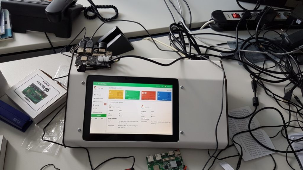 According to the trusted toolchain, the Critical app to control the trolley drawers (namely, the Trolley Control Unit app) has been designed using 4DIAC, and then modeled as a Chromosome node to ensure a trusted communication with the outside world. The generated code is verified by the SMV model checker. Critical apps can be uploaded (as suppliers) and downloaded (as subscribers) on/from the marketplace. Moreover, a beta-version of a Trusted app has been developed to perform prescription and administration of drugs, medical devices and clinical consumables: this application includes a patients’ database and works to assign therapies and drawers. However, since drawer indexes are randomly generated, the match between drawers and patients is not transparent: the two Execution Environments (EE) are then isolated from each other, but a secured communication can be performed.